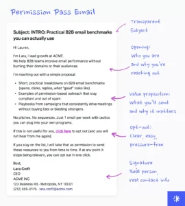 It’s not cold email (you’re not pitching anything). It’s not warm email (they may not know you). It’s transparent permission-seeking that acknowledges B2B relationships don’t always start with someone filling out a form.