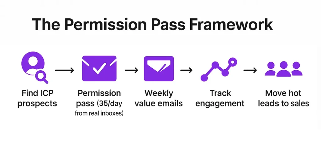 Sending infrastructure: Permission passes are sent from real people’s inboxes, up to 5 team members’ actual Gmail or Outlook accounts, with a maximum 35 per day per inbox. This isn’t bulk mail yet. It’s transparent introduction from real humans, which is why deliverability stays high.