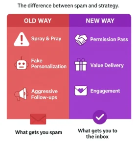 Here’s what actually works: transparent permission, genuine relevance, and value-first communication. You won’t reach as many people, but the people you reach will actually engage.